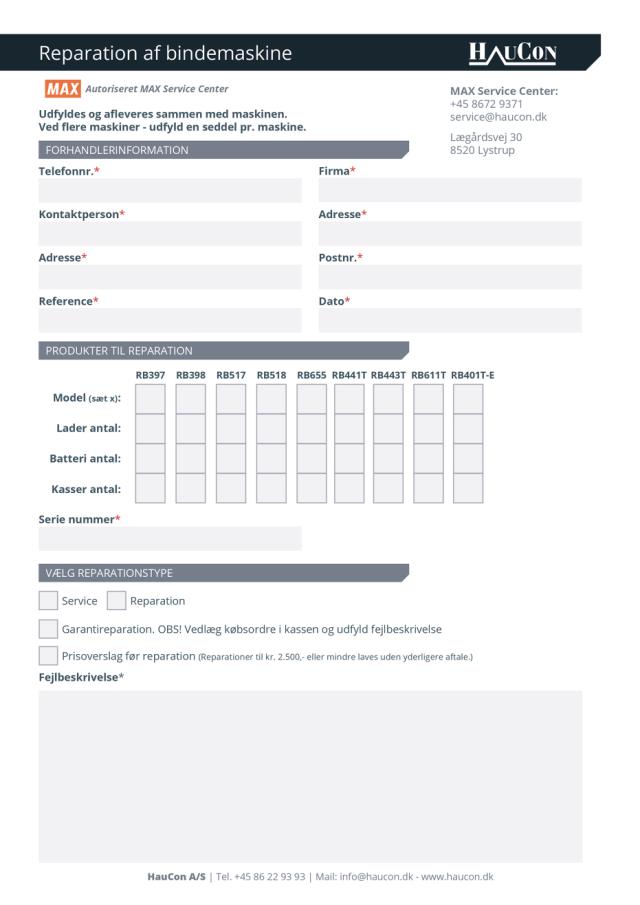 - Indleveres bindemaskinen uden udfyldt reparationsskema eller andre anmærkninger, udføres reparationer uden yderligere aftale.